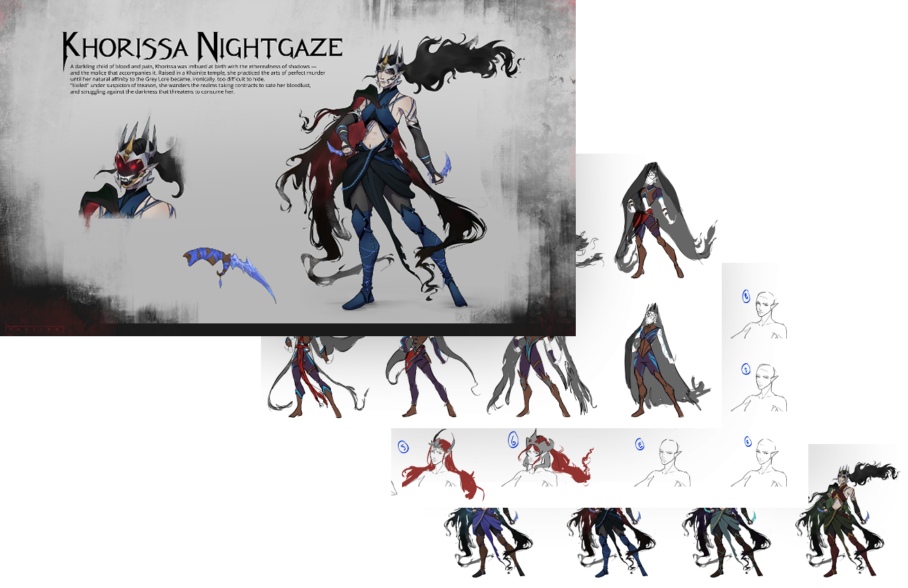 - Sketch sheets of outfit, hair, face, colour, and prop variations.